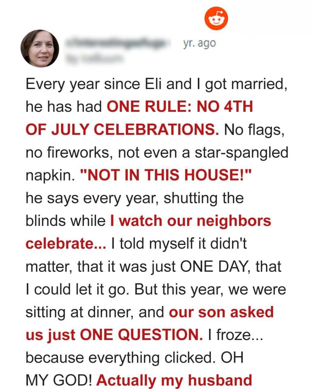 Every year since Eli and I got married, he made one rule stick like glue: no 4th of July.No flags, no fireworks, no sparklers, no barbecue. Not even a little napkin with stars on it.One year I tried putting up a tiny flag magnet on the fridge, and he walked in, saw it, and pulled it down like it burned him.“Not in this house,” he said then. “I mean it.”I asked him why, more than once.