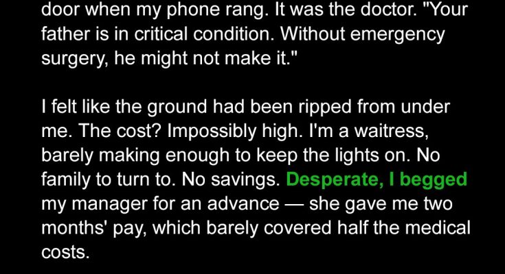 I just murmured a weak “I’ll figure it out” before ending the call.But I had nothing. No savings. No family to ask for help. Just a café job that barely covered rent.By the time I arrived at work, my chest felt hollow. I barely noticed the smell of coffee beans or the familiar chime of the bell as I pushed through the door. I made a beeline for my manager.“Lisa, I… I need an advance. Please. Anything you can spare.”Lisa’s face softened, but her hands twisted nervously.