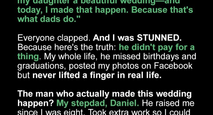 When my biological dad stood up at my wedding and claimed he gave me the day of my dreams, I froze in shock. The truth? He didn’t spend a dime. But the man who really made it all happen sat quietly across the room, heartbroken.The lights in the reception hall glowed soft and golden, like the end of a perfect sunset. Strings of fairy lights hung across the ceiling, and the music drifted gently, something jazzy and warm.