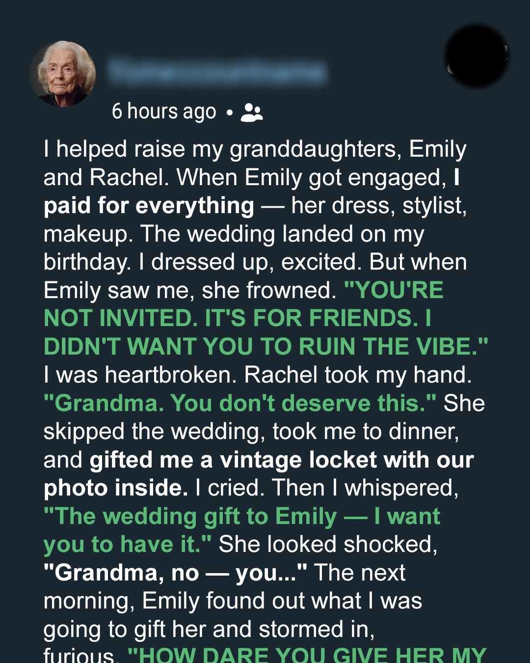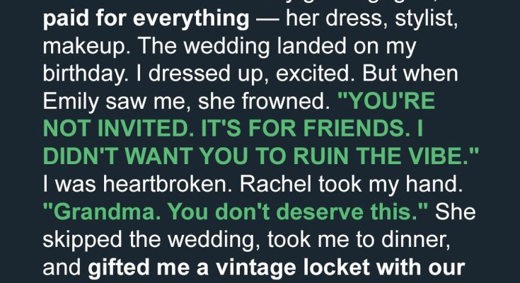 There are moments in life when someone you helped raise looks at you like you’re nothing but a burden. That’s what happened when my granddaughter told me I wasn’t welcome at her wedding because I didn’t “fit in.” What she didn’t know was, I had a gift planned for her… one she’d never see.