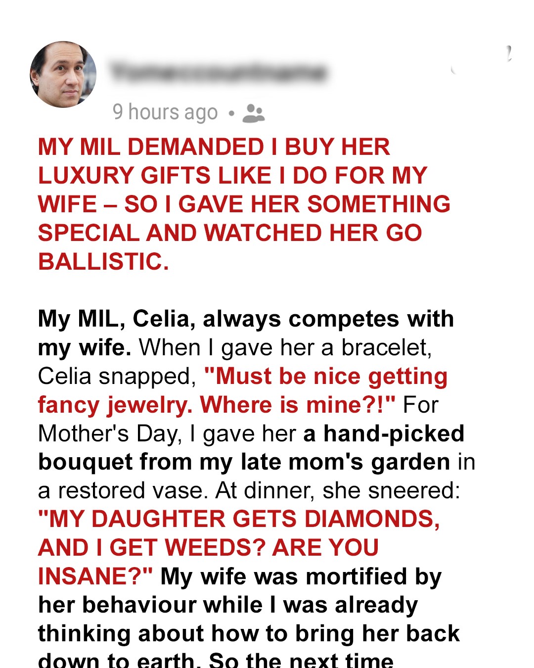 That’s Jane. Always quick with a comeback, but even quicker with affection. We don’t have kids yet, though we’ve been talking about it more lately.For now, it’s just us, and honestly, our life together is pretty great. Jane is everything I could have asked for in a partner.Everything about our relationship is perfect, except for one glaring complication. Her mother, Celia.My mother-in-law has always had a… competitive streak. Especially when it comes to my wife. Every time I give Jane something thoughtful, Celia somehow makes it about herself.