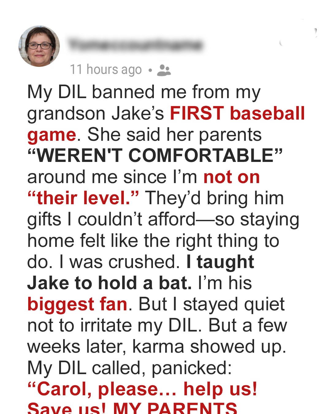 I’d been counting down the days to my grandson’s first baseball game, bursting with pride and excitement. But just before the big day, my daughter-in-law told me I couldn’t come. At first, I believed her excuse. Then I found out the real reason, and I’ll never forget how it made me feel.