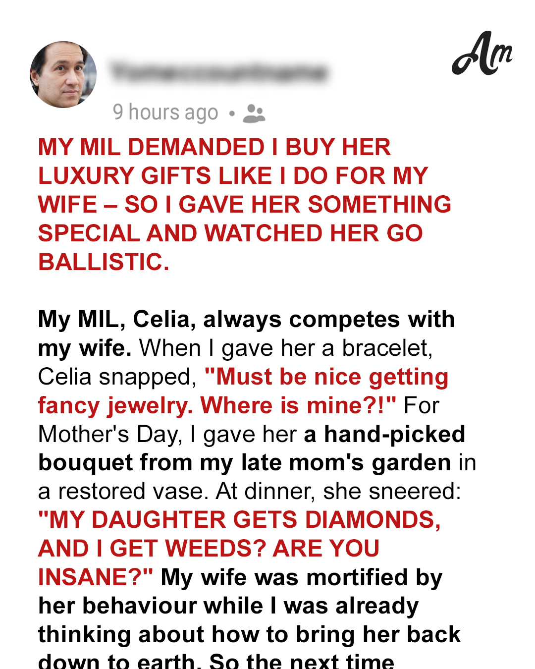 That’s Jane. Always quick with a comeback, but even quicker with affection. We don’t have kids yet, though we’ve been talking about it more lately.For now, it’s just us, and honestly, our life together is pretty great. Jane is everything I could have asked for in a partner.Everything about our relationship is perfect, except for one glaring complication. Her mother, Celia.My mother-in-law has always had a… competitive streak. Especially when it comes to my wife. Every time I give Jane something thoughtful, Celia somehow makes it about herself.