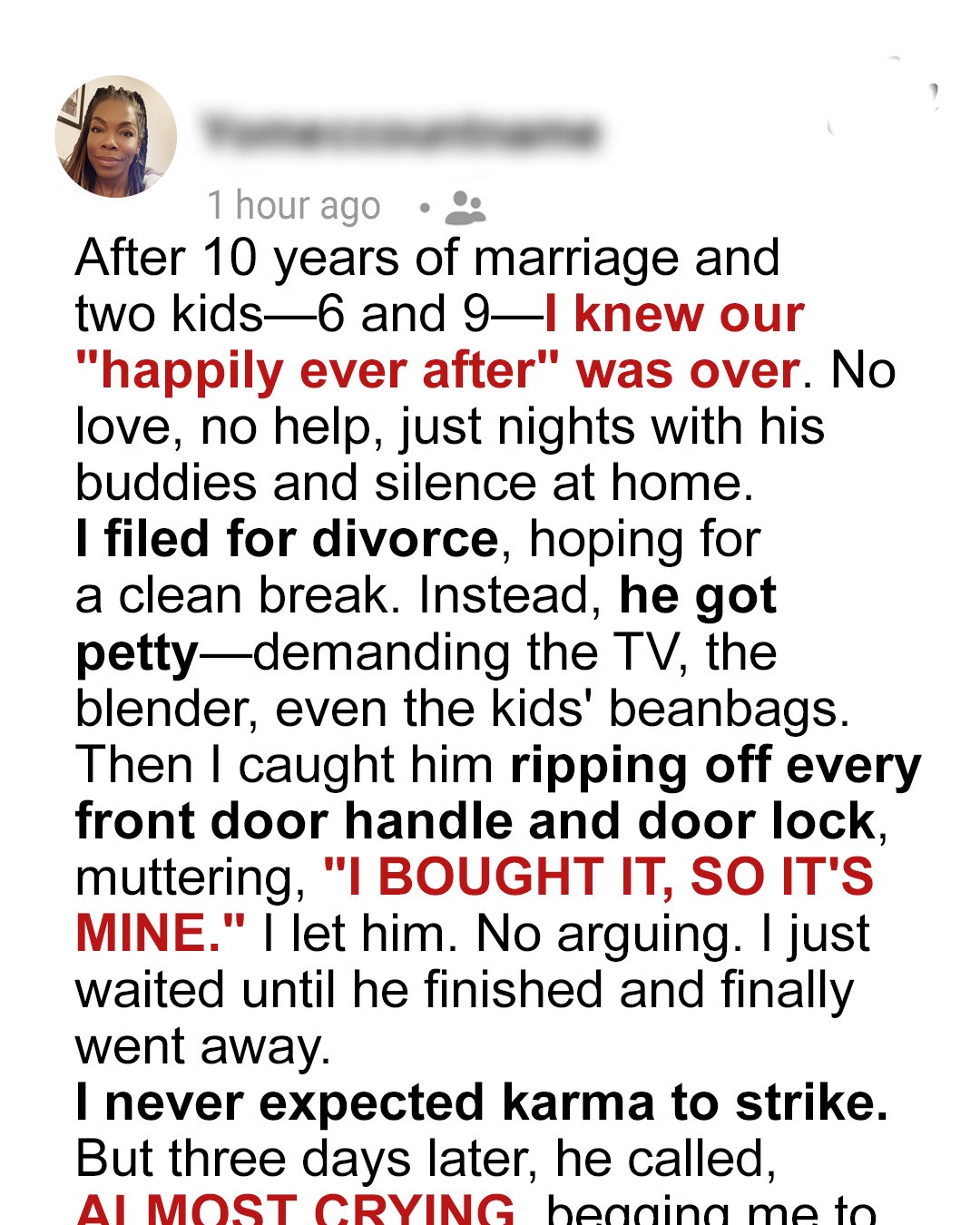 They say the true colors of a person show when a relationship falls apart. Mine glowed neon when my husband of ten years took the door handles after our divorce because he “paid for them.” I stayed silent and let karma do its thing. Sure enough, my ex called me almost in tears three days later.I stood at the kitchen window, my fingers wrapped around a mug of lukewarm coffee, watching the rain streak down the glass. The reflection staring back at me wasn’t the same woman who’d said “I do” a decade ago. That woman had dreams. She believed in forever.