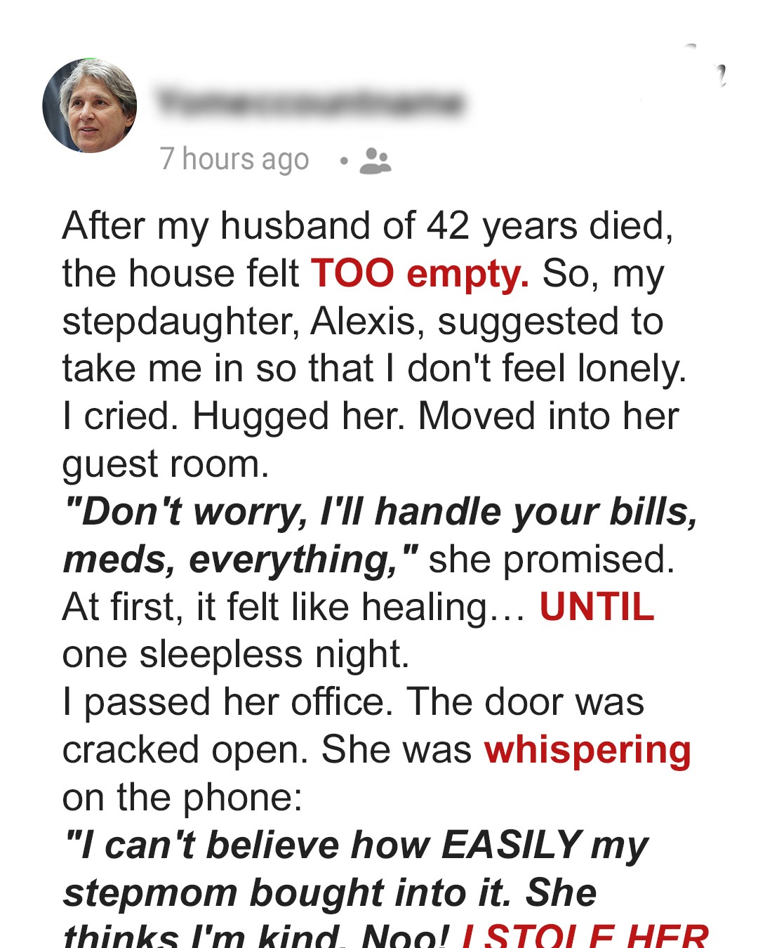 On the third day after the funeral, Alexis showed up at my door. My stepdaughter.She’d always been good to me, even when her biological mother tried to poison her against me in those early years.“Come live with us, Mom,” she said. Her voice was soft but certain. It felt like she’d already decided and was just letting me in on the plan. “You shouldn’t be alone right now.”Those words cracked me open.Tears came fast and hard, the kind that hurt your chest and left you gasping.