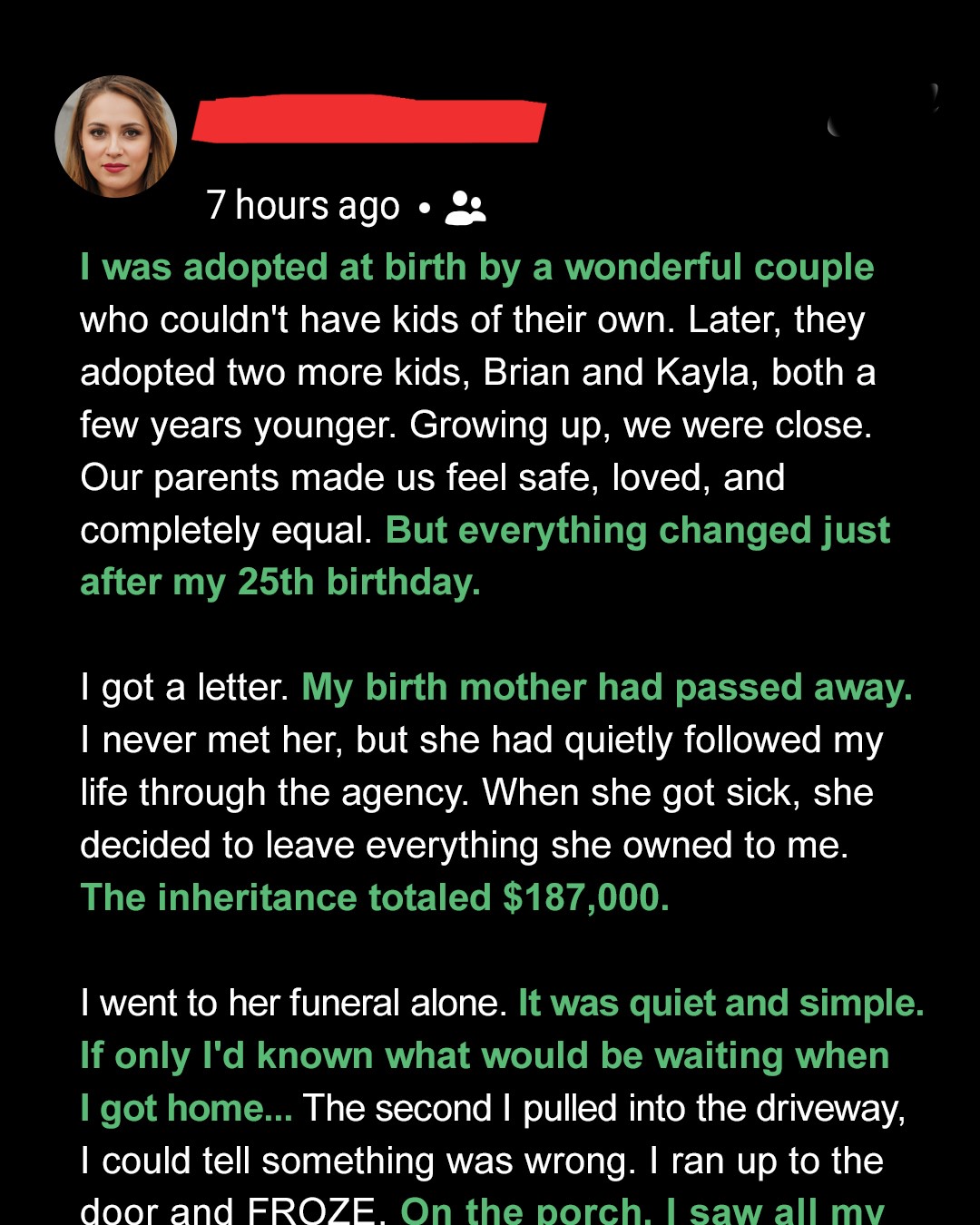 When 25-year-old Taylor inherits $187K from the birth mother she never met, she expects support from her adoptive family. But when she returns home after the funeral, she discovers a nasty surprise waiting for her.I grew up believing I was one of the lucky ones. Adopted as a baby by a couple who couldn’t have children of their own, I only knew love.Brian and Kayla came later. Mom and Dad adopted them too.