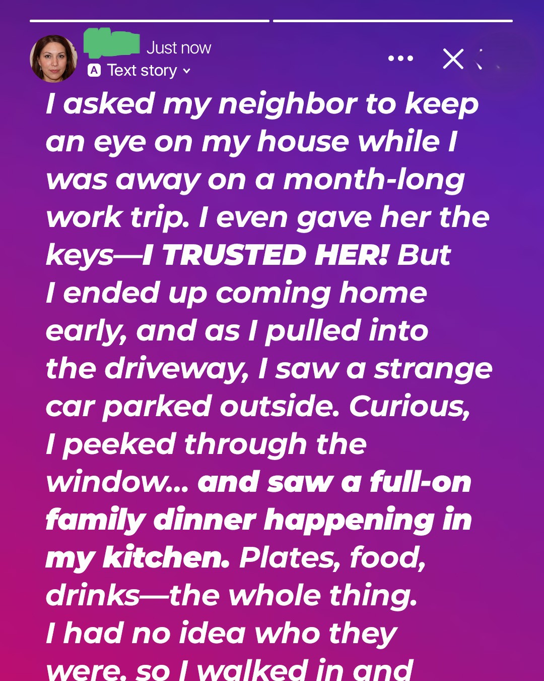 I left for a month-long work trip, trusting my neighbor and friend to watch my house. But when I returned early, I found a strange car in the driveway… and a family of strangers eating dinner in my kitchen!The air smelled like late summer — warm pavement and cut grass — as I handed Lisa my house keys.“Just the usual,” I said with a tired smile, heaving my luggage into the trunk with a solid thunk. “Water the indoor plants and the garden, maybe check the mail.”