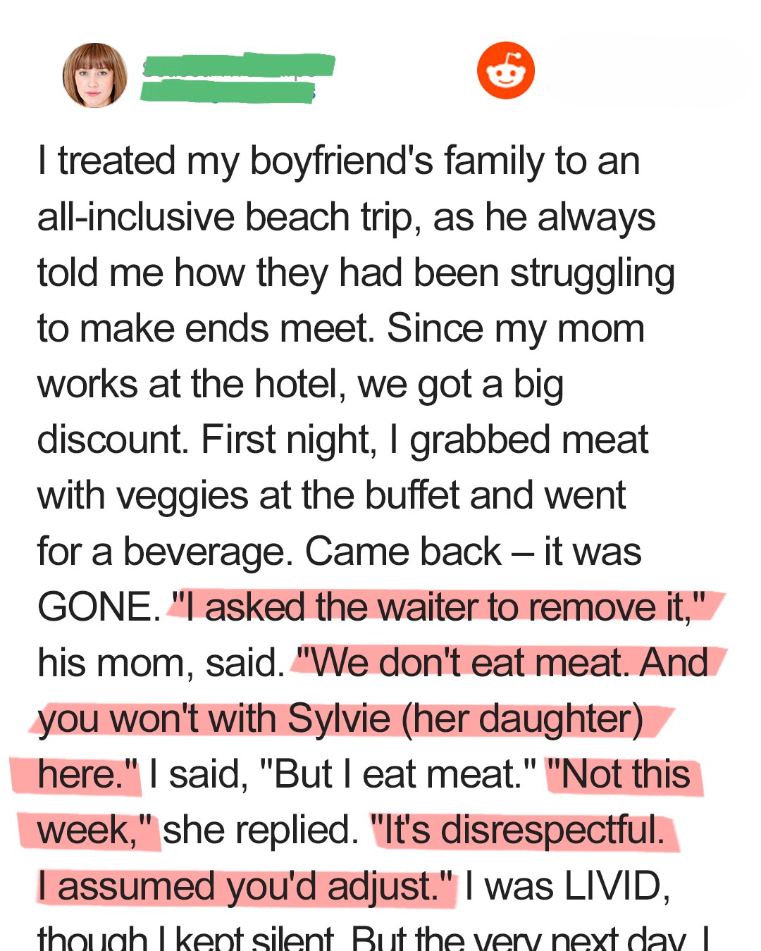 When I treated my boyfriend’s family to a beach vacation, his mom welcomed me like a daughter. Then she had my dinner plate cleared without asking and announced, “We don’t eat meat in this family.” That’s when I cooked up my revenge.Every story my boyfriend Jake told me about his family made them sound like the Waltons, complete with heartwarming moments and unconditional love.“We’re tightly knit,” he’d say, his eyes lighting up. “Even if we don’t have much, we have each other.”