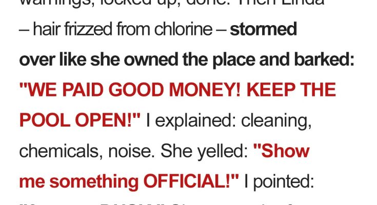 I was two hours past my shift, waiting for maintenance to finish some overdue repairs to the water filtration system near the pool pump. That’s the only reason I was still on-site after closing up that fateful day.Normally, I’d be home by 10:15 p.m., but my manager, Ray, had asked me to stick around in case the maintenance guy needed access to the storage closet that held the chemical logs.