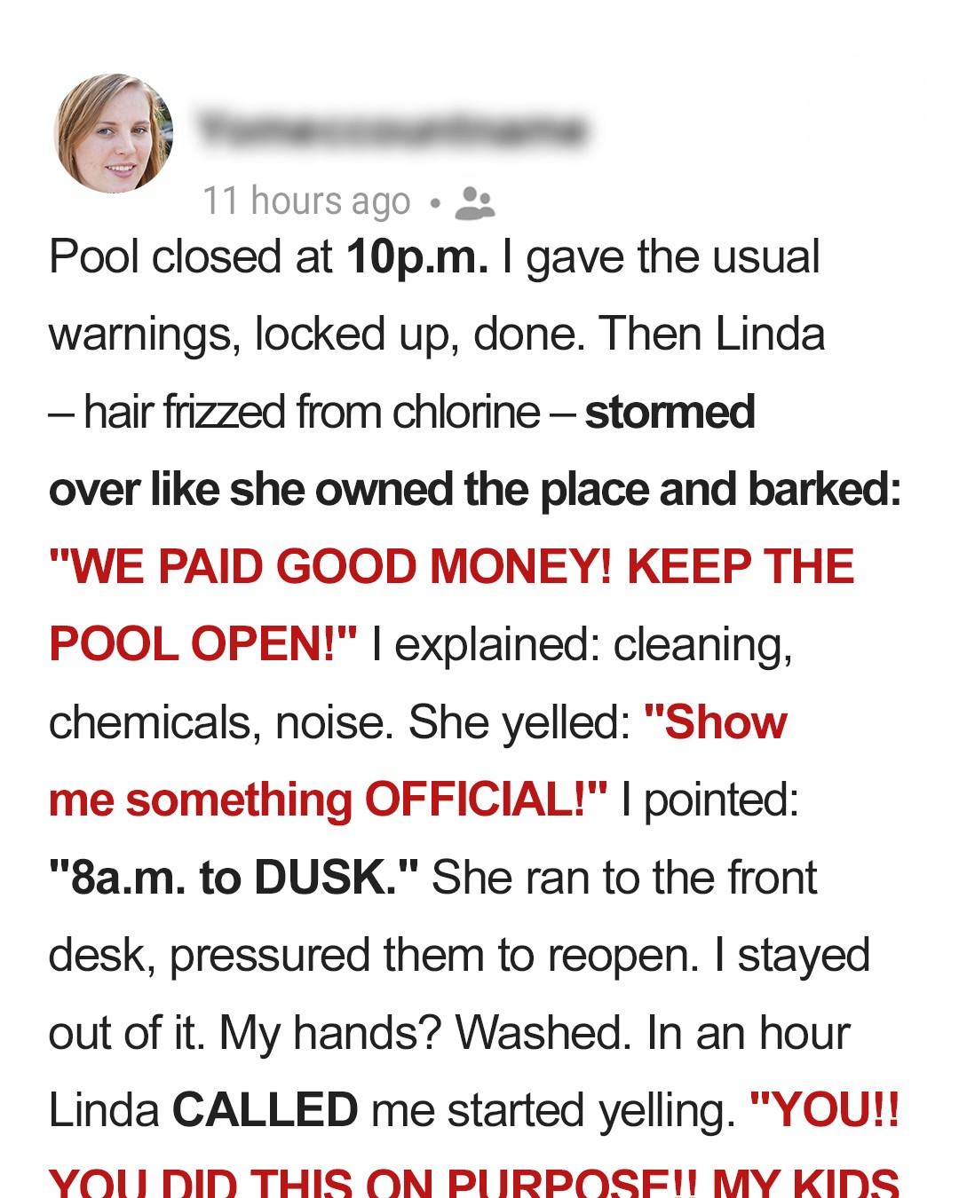 After she hysterically explained what happened, I replied, “Ma’am, the pool closes at 10 p.m. We begin chemical treatment immediately after, every single night. I told you this earlier.”