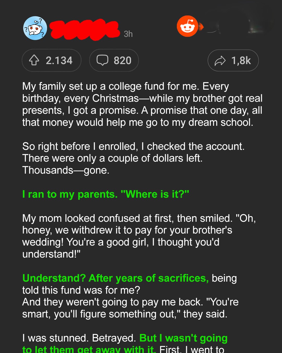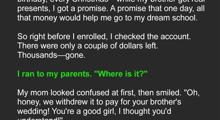 “Your sister’s fund was just sitting there, and this is an important event. A wedding is a once-in-a-lifetime moment, Sarah. College? You can always find a cheaper school.”