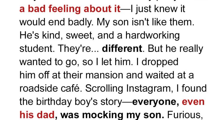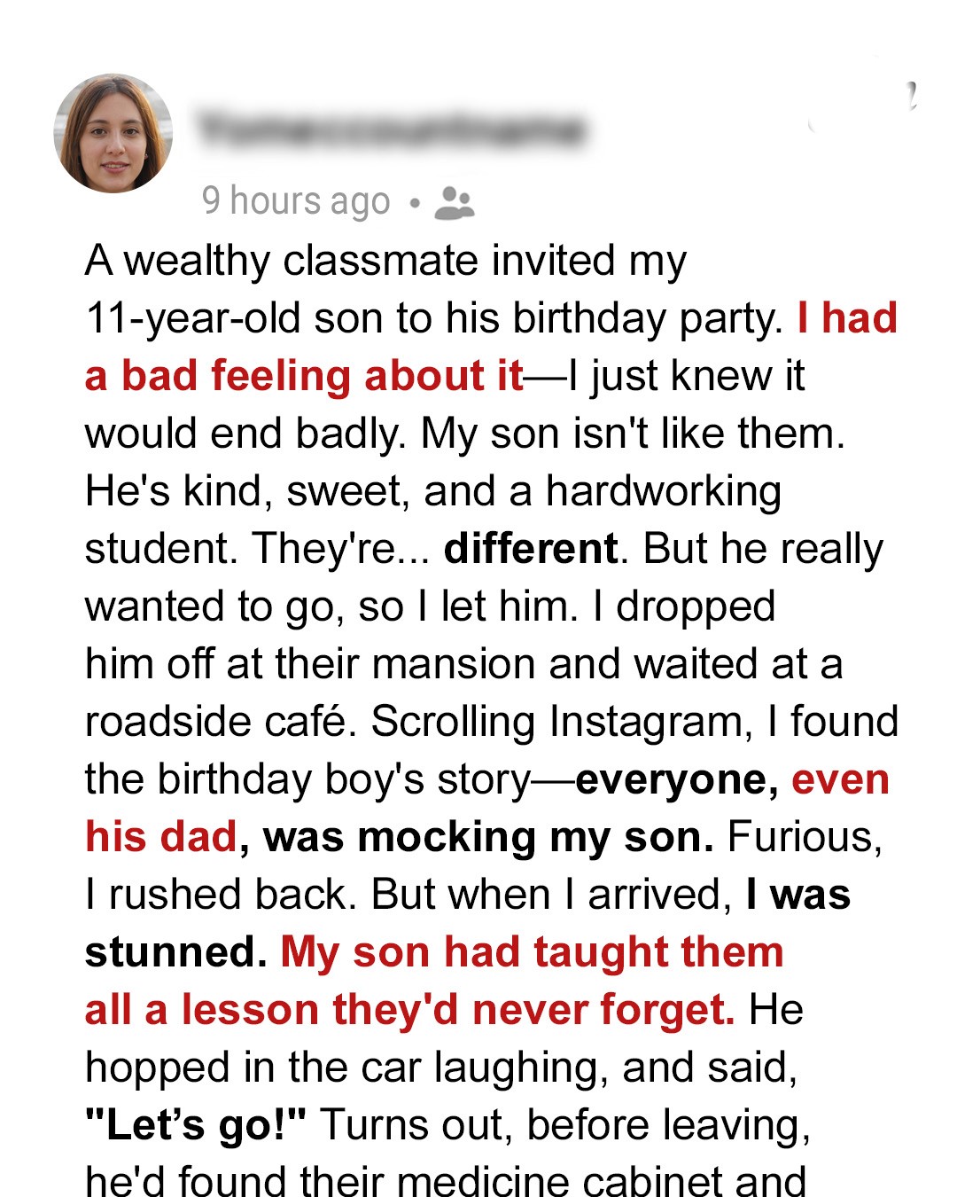 My son thought he’d finally won over the rich kids who bullied him in school when he was invited to one of their birthday parties. But they just bullied him even more! Finally tired of the abuse, my clever son pulled a prank they’d never forget!It’s just me and my son, Jake. No husband, no family nearby, just the two of us against the world. We don’t have much, but we have enough. So, when Jake got invited to a birthday party, we thought it would be a good way to integrate him with his rich classmates. But that backfired in the worst way!