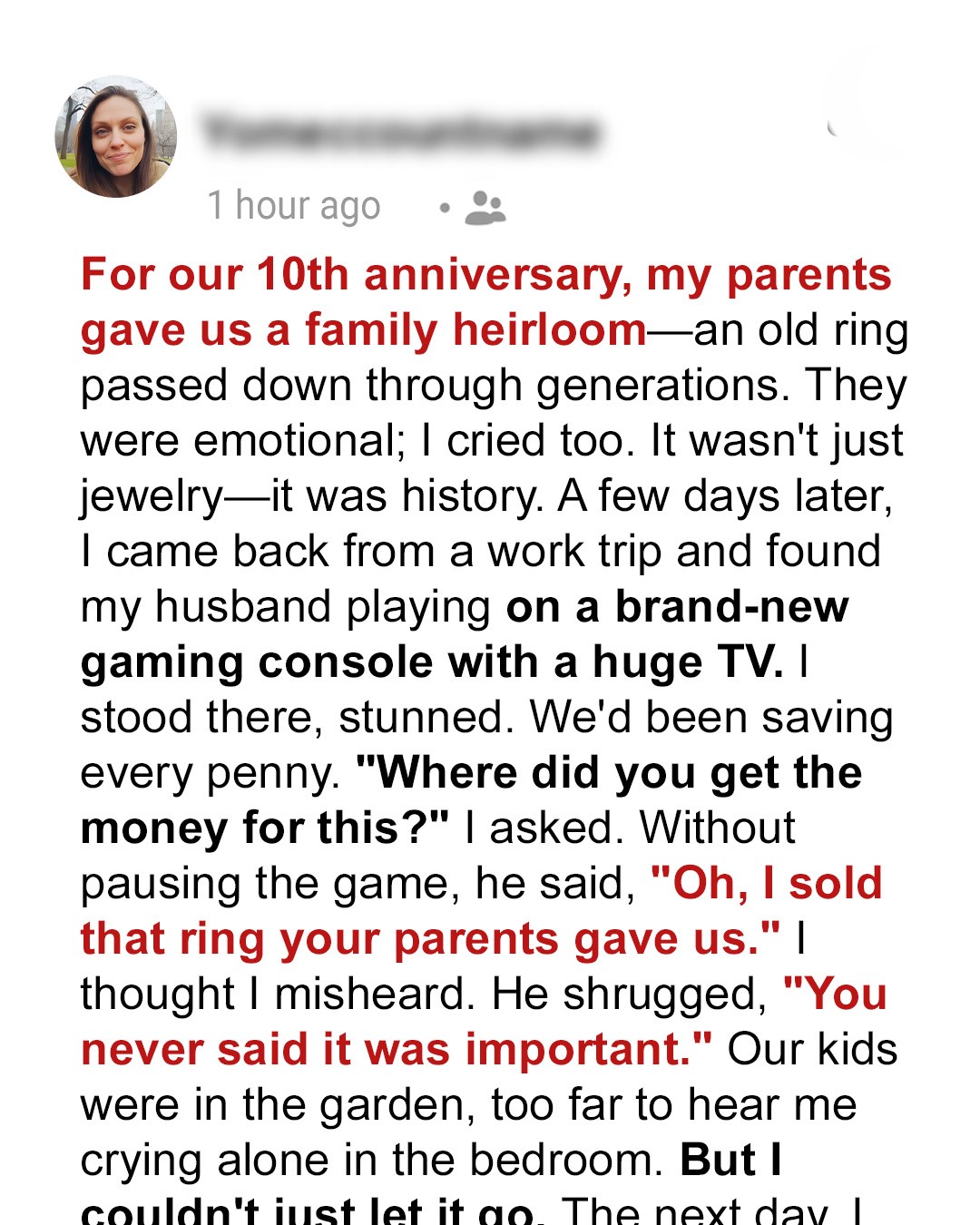 I always believed my husband, Derek, was thoughtful and caring. Then, he sold my precious family heirloom ring to buy himself a gaming setup while I was away on business. When I confronted him, he just shrugged and said it was “just some old ring.” What happened next taught him a lesson he’ll carry for the rest of his life.The ring meant everything to me.