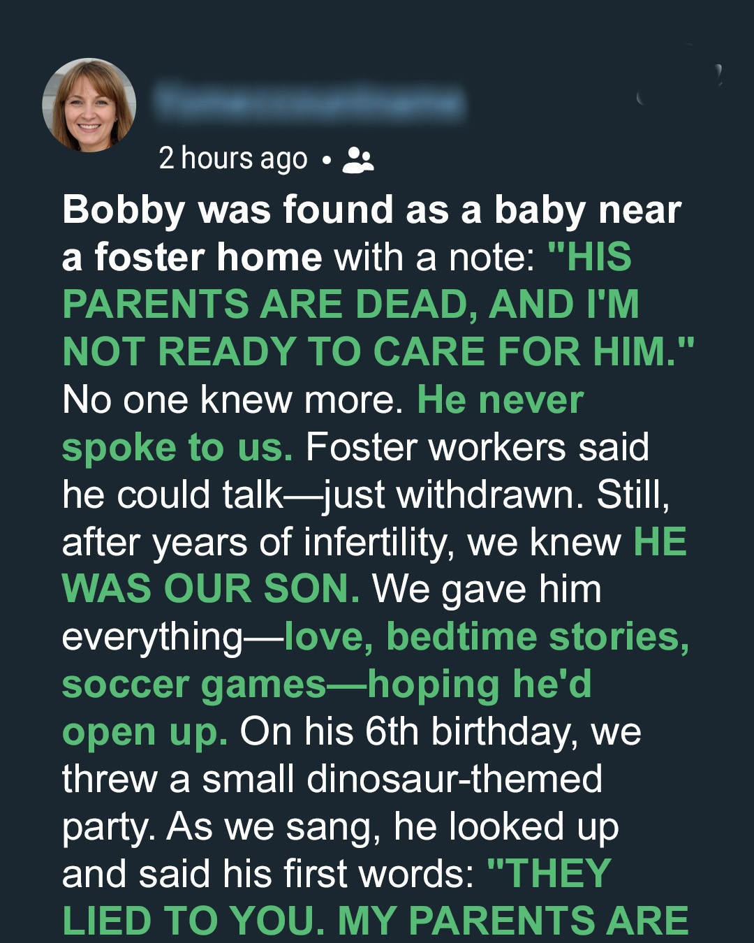 When we adopted Bobby, a silent five-year-old boy, we thought time and love would heal his pain. But on his sixth birthday, he shattered our lives with five words: “My parents are alive.” What happened next revealed truths we never saw coming.I always thought becoming a mother would be natural and effortless. But life had other plans.When Bobby spoke those words, it wasn’t just his first sentence. It was the beginning of a journey that would test our love, our patience, and everything we believed about family.