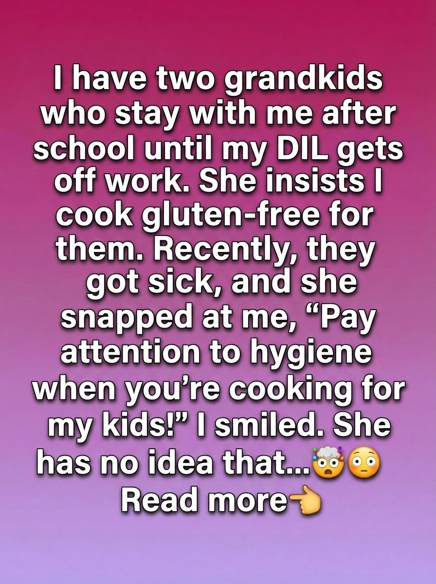 Their mother—my daughter-in-law—worked long days, so I happily watched them until she arrived. The only rule she insisted on was that everything I cooked be gluten-free. I respected that completely.