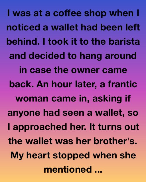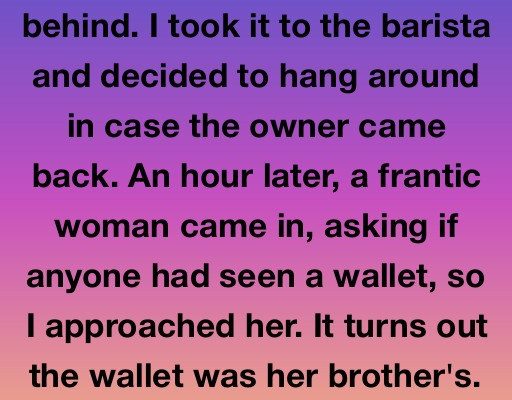 I was at a coffee shop when I noticed a wallet had been left behind. I took it to the barista and decided to hang around in case the owner came back. An hour later, a frantic woman came in, asking if anyone had seen a wallet, so I approached her.It turns out the wallet was her brother’s. My heart stopped when she mentioned he had been missing for two days. She looked exhausted—like she hadn’t slept.