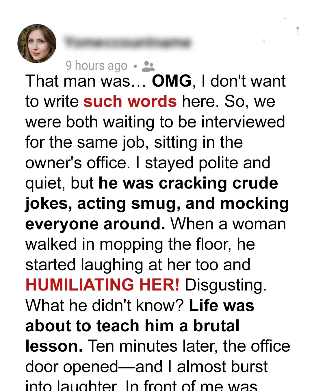 After a few minutes, the door creaked open again. At first, I thought it was someone new — maybe the actual hiring manager. But no. Same woman. Same calm energy. Only this time, she was transformed.