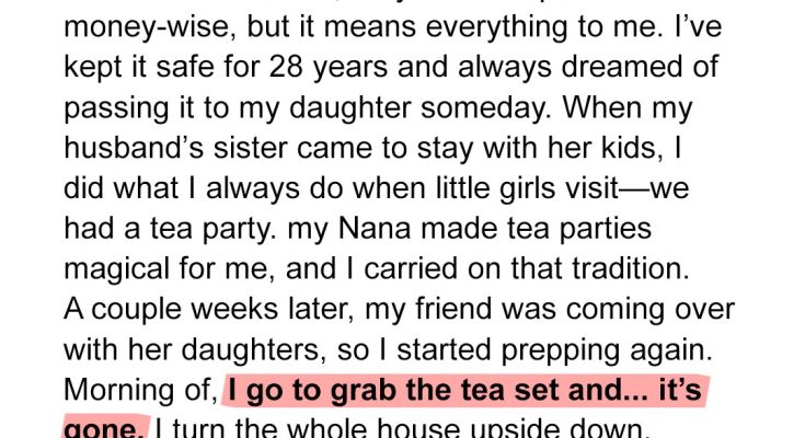 “No, Greg,” I said, the words dragging through my throat. “It was my tea set. You stole something that didn’t belong to you. Then you lied about it. Gaslit me for days… You bought me some knock-off garbage from a store and called it a solution. You could have given that to the child!”