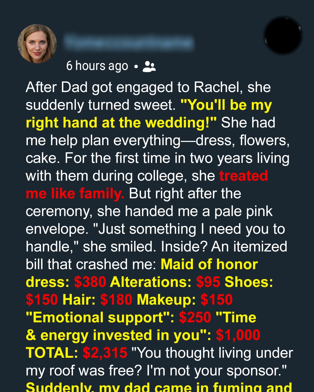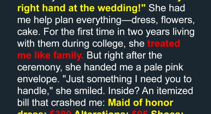 When my stepmom made me her maid of honor, I thought we were finally becoming a real family. But moments after her vows, she handed me an itemized bill… charging me for everything. I froze, my eyes stinging with disbelief. But she didn’t realize that my dad was standing right behind her.Do you know that feeling when someone is acting “too” nice? Like they’re overcompensating for something? That was Rachel, my stepmother. And I’m still crushed by what she did on the day she married my dad.