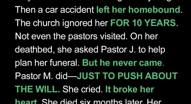 Her name was Eleanor and she served her church for nearly five decades without ever asking for anything. Until she needed them. And they gave her nothing.Not one church leader came. Not by mistake but by design. They were not invited.It wasn’t always like this, though. My grandmother was a pillar in that church. A Southern Baptist congregation that prided itself on “family values,” tradition, and photo ops of the pastors shaking hands with senators.She was the kind of woman who showed up without being asked, who filled in for the sick nursery worker, cooked extra casseroles, and stayed late to wipe down folding tables.