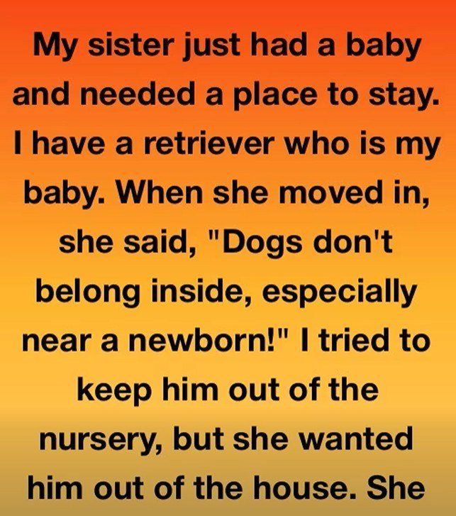 My sister just had a baby and needed a place to stay. I have a retriever who is my baby. When she moved in, she said, “Dogs don’t belong inside, especially near a newborn!” I tried to keep him out of the nursery, but she wanted him out of the house.