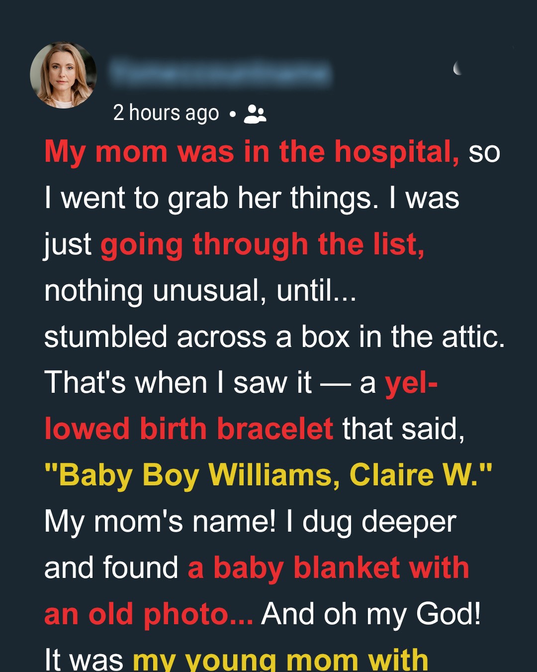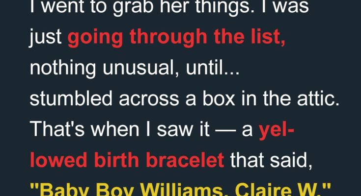 I expected the usual: old photo albums or yellowed papers she hadn’t used in years. Instead, my hand froze as I pulled out a small, yellowed hospital bracelet.The text on it blurred as I reread the name over and over:“Baby Boy Williams, 12-15-83, Claire W.”The decision to place her in a care facility weighed on me like a lead blanket.