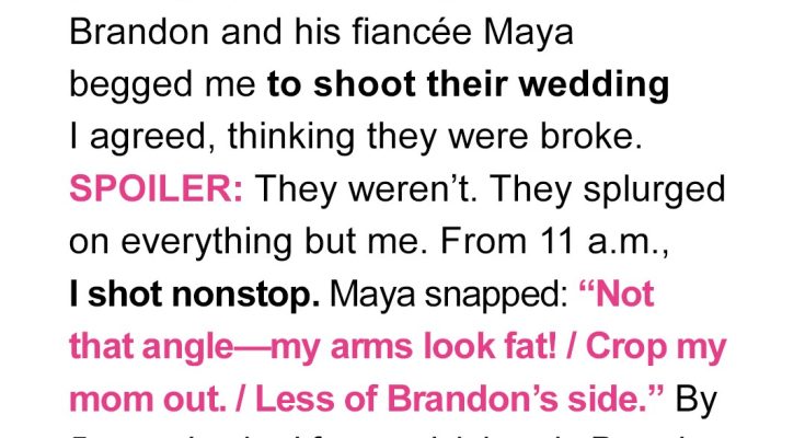 Brandon looked at me with complete seriousness. “You’re working, Alice. Photographers don’t eat at weddings. If you want to eat, you’re done for the day.”