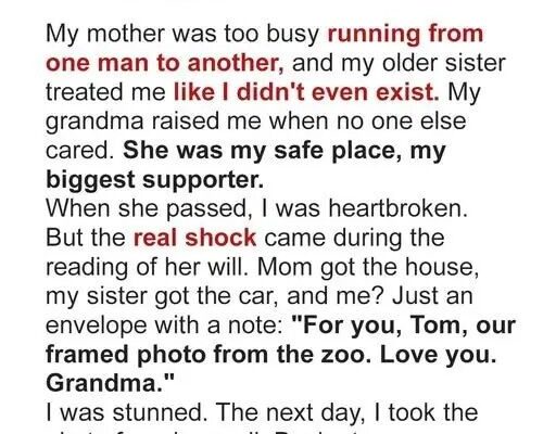 Inside was an old photo of Grandma and me at the zoo: her in her favorite green cardigan, holding my hand as a giraffe leaned down like it was bowing to her. I smiled, because what else could I do? But the smile cracked before I made it to my car.No jewelry. No land. No keepsake of value.