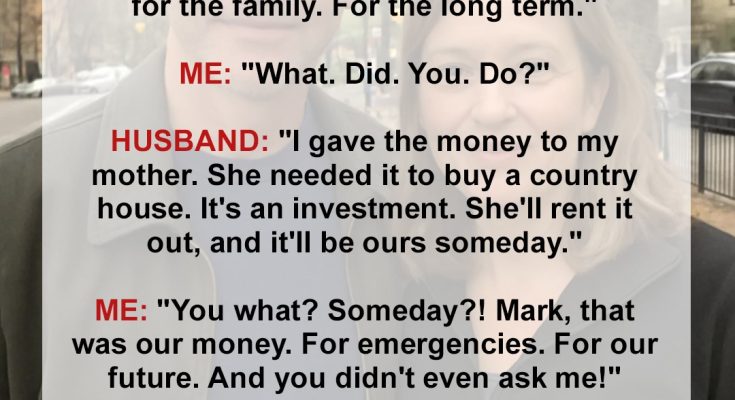 “I gave the money to my mother because she needed it to buy a country house. It’s an investment, really. She said it’ll be ours when she passes, and until then, she’ll rent it out for income. She needed it more than us right now.”