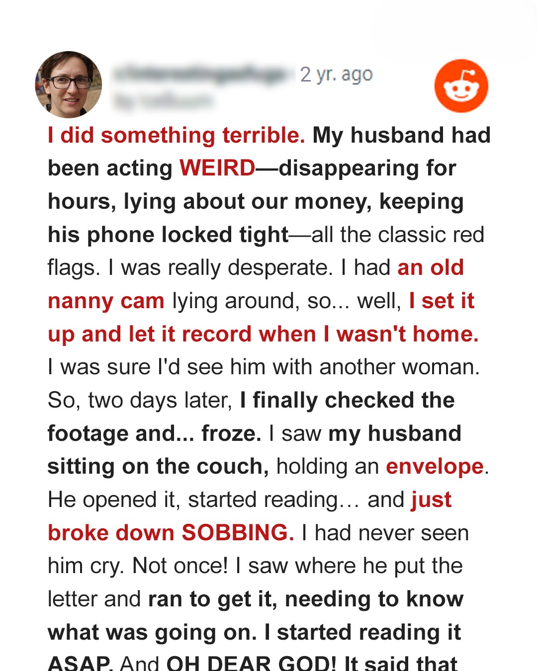 When my husband started acting strange, I suspected the worst. I decided to get actual proof of his betrayal, but what I discovered broke me down in tears! Luckily, the truth brought us closer than ever.I had always considered myself a reasonable person, someone who approached situations with a level head. But when it came to my marriage, all that seemed to fly out the window! For weeks, maybe even months, a heavy cloud of doubt hung over my head. I believed my husband was cheating, but when I discovered the actual truth, I was shattered.
