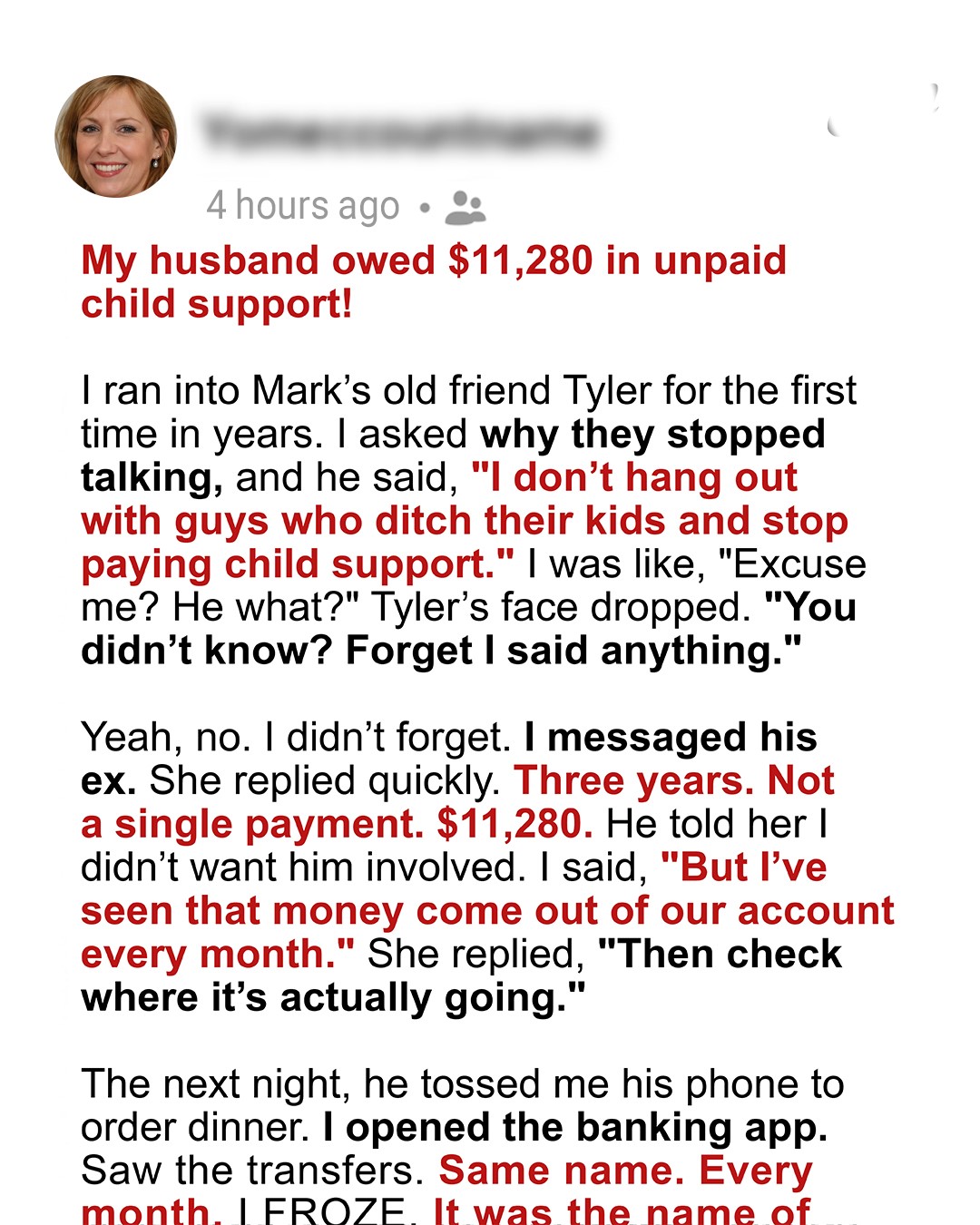 It couldn’t be true. Mark told me he paid child support religiously. Every month, he’d mention how tight money was because of his “obligations.” He’d managed our finances from day one, insisting I didn’t need to stress about the complicated stuff.