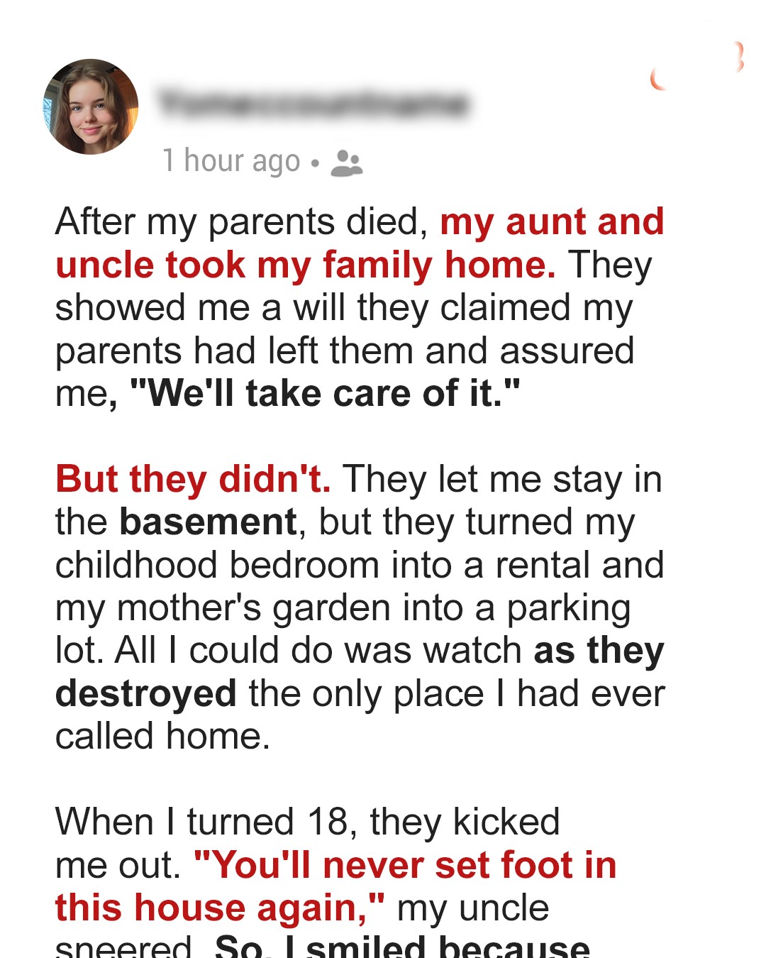 At fourteen, I discovered what they’d done. I overheard Uncle David on the phone, boasting about the rental income.