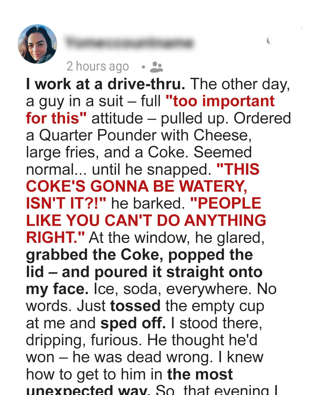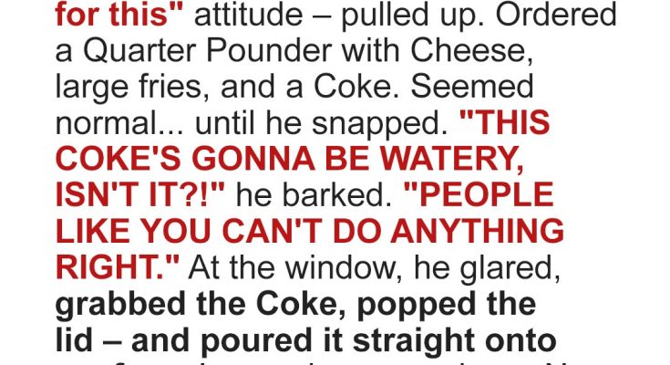 An entitled customer rolled up to the drive-through and ordered food like he owned the place. Then he humiliated me in front of my coworkers and poured Coke in my face before fleeing in his fancy car. What happened next was unforgettable… because I made sure he regretted every second.That morning was already off. My kid, Mason, had spilled syrup on his homework, and we missed the bus. I was 10 minutes late and already dragging. Cindy, my coworker, handed me a cup of coffee like she knew I was hanging by a thread.