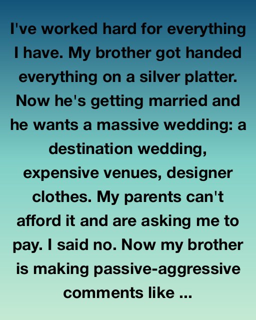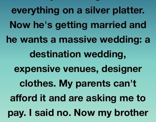 I’ve worked hard for everything I have. My brother got handed everything on a silver platter. Now he’s getting married and he wants a massive wedding: a destination wedding, expensive venues, designer clothes.