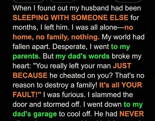 And now he was telling me to swallow betrayal for the sake of appearances. “I need air,” I muttered, pushing back my chair. The garage smelled like oil and dust, thick and familiar.