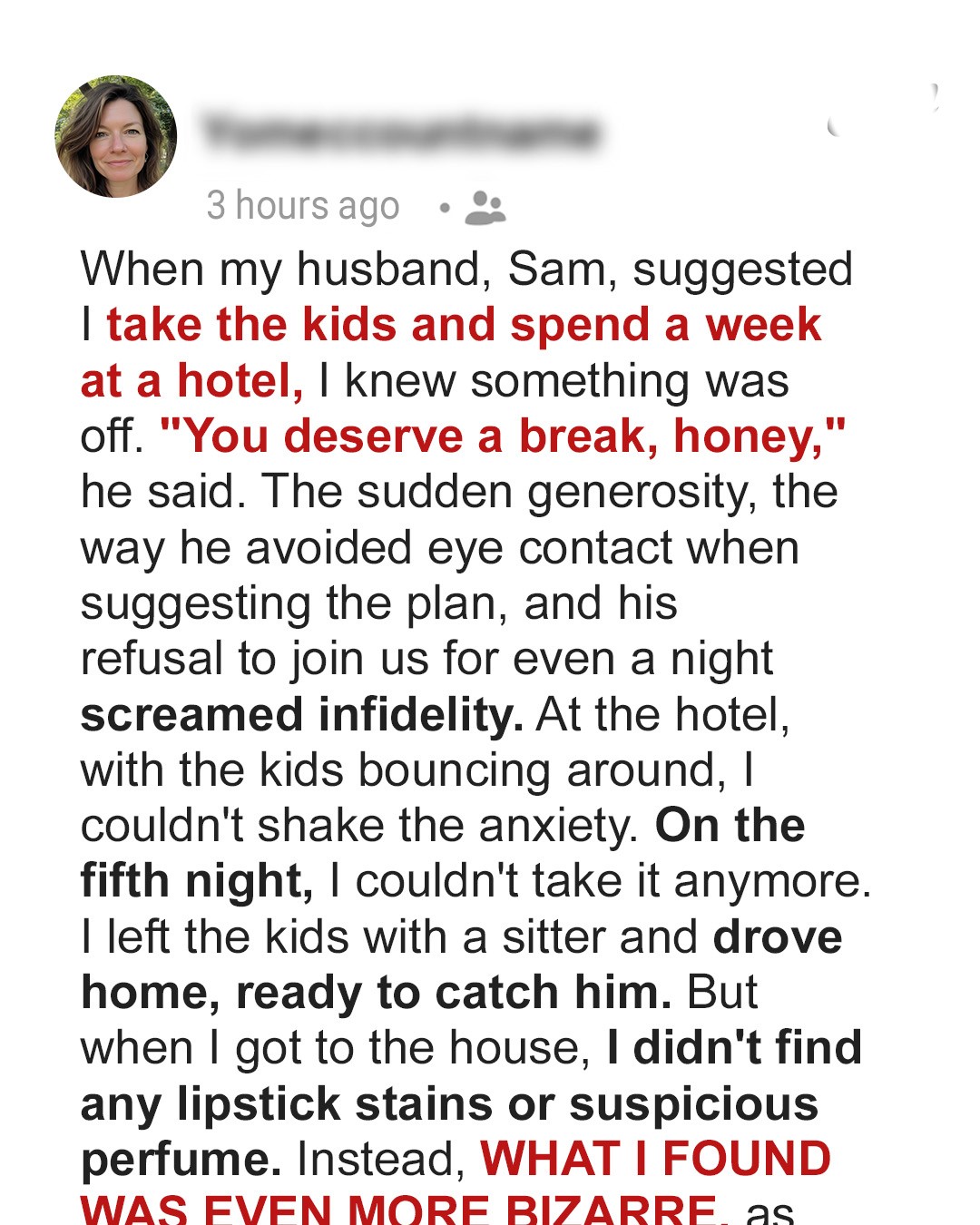 When Sam suggested a surprise getaway for me and the kids, my gut told me something was wrong. His odd behavior screamed infidelity, but when I returned home early to catch him in the act, I was forced to confront a more sinister truth.I should’ve known something was off when Sam suggested the “vacation.” He’d never been the thoughtful type — more likely to forget our anniversary than plan a surprise getaway.