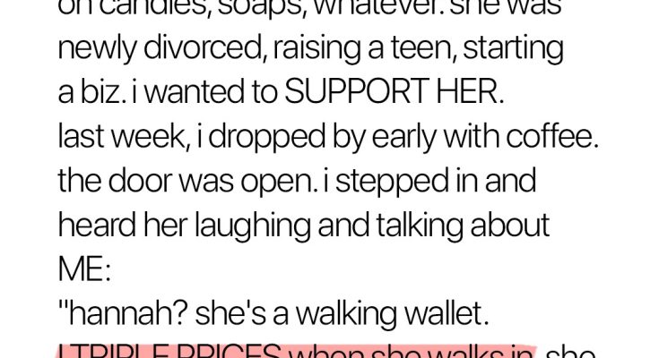 “Oh, Hannah?” Marla’s voice carried clearly through the thin walls. “Please. She’s a walking wallet. I triple my prices when she walks in! She practically begs me to rip her off.”