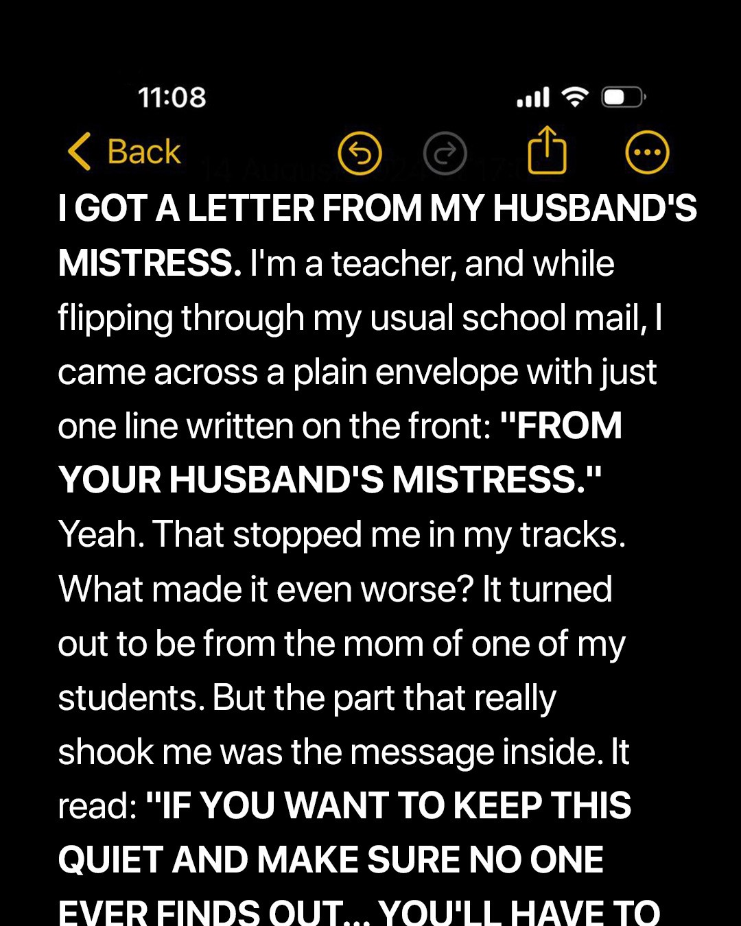 Nothing special. Nothing out of the ordinary.Until I found the plain white envelope with my name scrawled across the front in unfamiliar handwriting, and below it: “From your husband’s mistress.”Yeah. That stopped me in my tracks.“This has to be a mistake,” I whispered to myself, but the paper trembled in my hand.I tucked it into my purse without opening it. Whatever this was, I wasn’t going to fall apart at school.A few minutes later, locked in a restroom stall at a gas station three blocks from my house, I finally tore open the envelope.