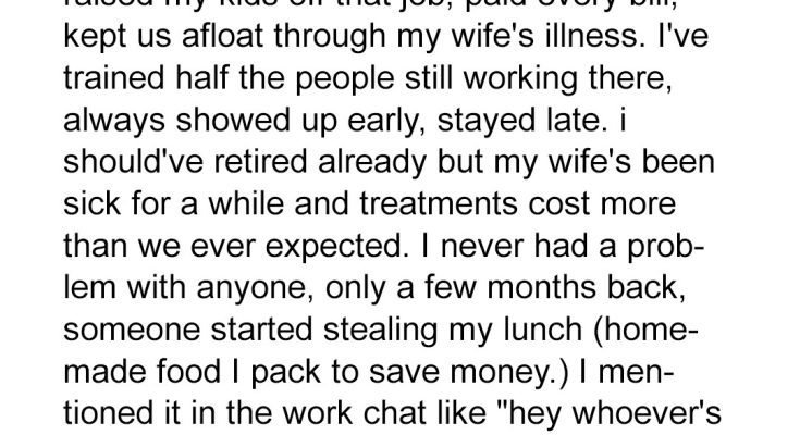 This was the third time this week. Someone was taking my food — not just grabbing it by mistake, but deliberately stealing the lunch my sick wife had made with shaking hands.