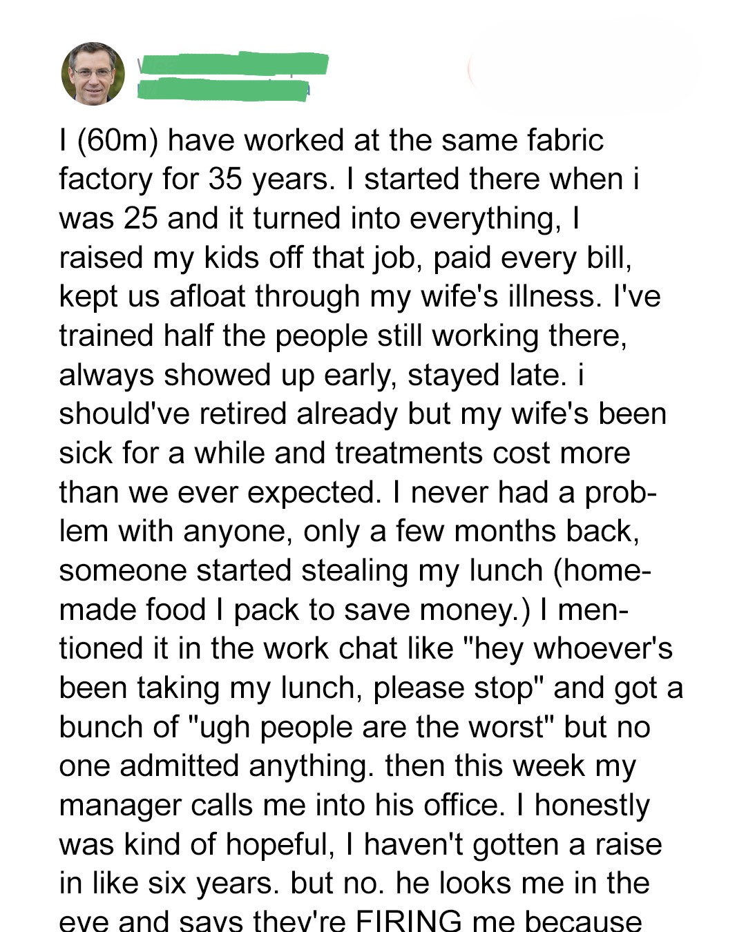 “I’ve been here 35 years. I’ve trained half your workforce. I’ve never missed a day, never caused trouble—”