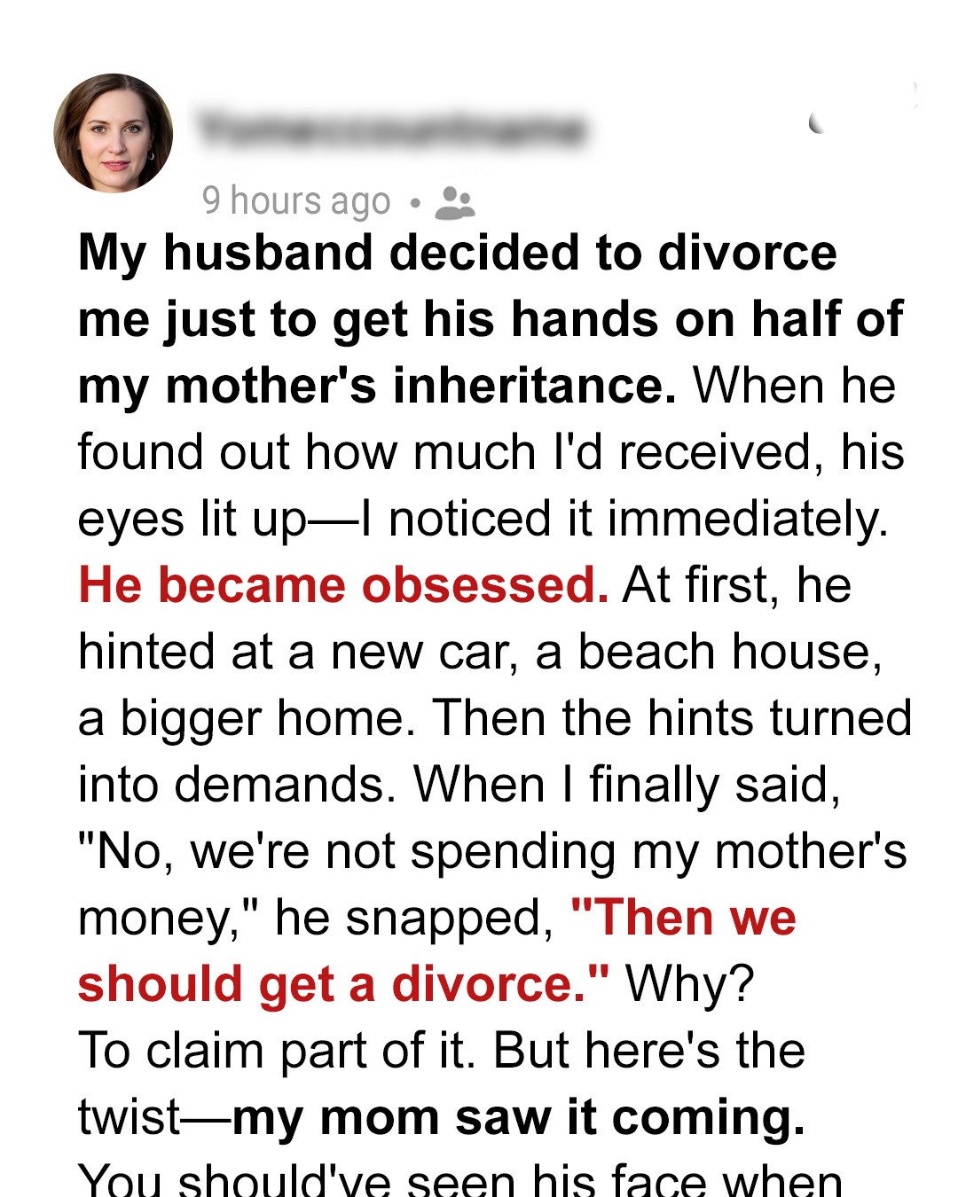 My Husband Filed for Divorce Right After I Inherited My Mom’s Fortune – He Thought He Hit the Jackpot, but My Mom Outsmarted Him