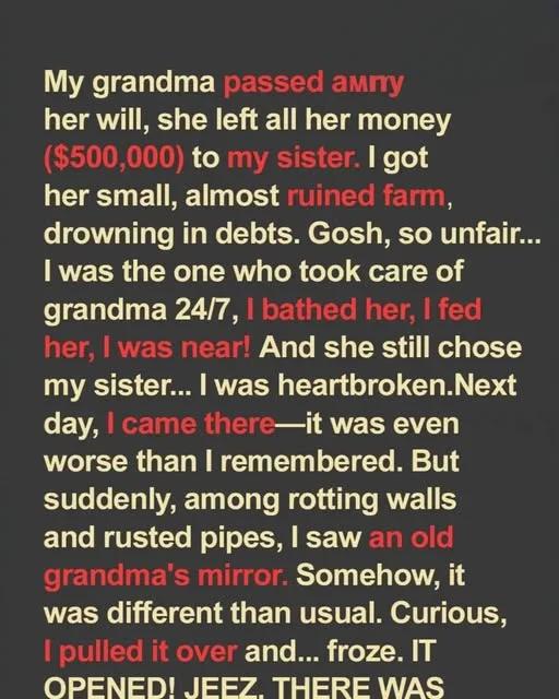 At the will reading, Claire got $500,000, while I inherited Grandma’s crumbling farmhouse “with all its contents and responsibilities.”No gasps, no fanfare—just the weight of a decaying roof and moldy floors. But when I found the hidden mirror in the upstairs closet and pulled its handle, I uncovered a letter addressed to me. In it, Grandma said she chose me because I’d understand: some things matter more than money.