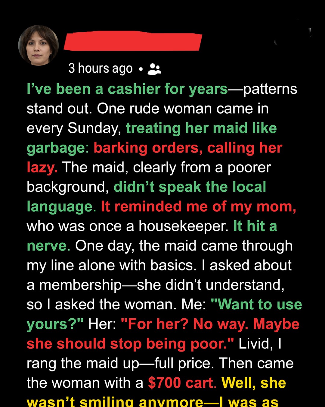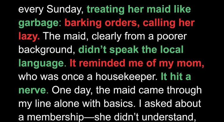 Being a cashier means you deal with all sorts of people daily, including the selfish, self-entitled ones, like this one rich woman. After seeing her mistreating her maid in the store, I put aside my fears and stood up for a fellow working-class woman!I’ve been a cashier at a supermarket for over eight years. It’s not glamorous, but it pays the rent and gives me a strange front-row seat to human behavior. After a while, you start to memorize the quirks and patterns of your regulars. But some people don’t just blend into the crowd; they leave an imprint.