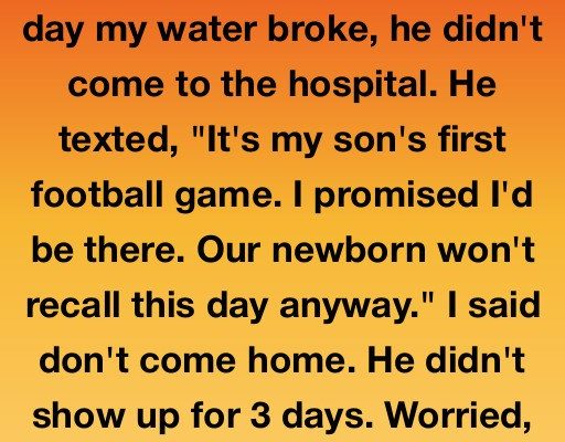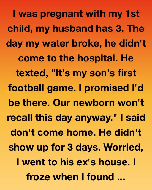 I was pregnant with my first child, my husband has three. The day my water broke, he didn’t come to the hospital. He texted, “It’s my son’s first football game.I promised I’d be there. Our newborn won’t recall this day anyway.” I said don’t come home. He didn’t show up for three days.Worried, I went to his ex’s house. I froze when I found his car parked in her driveway. I didn’t even knock.