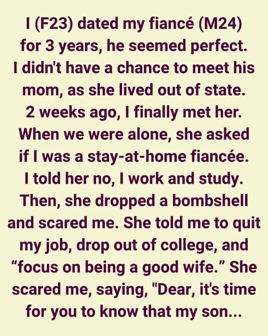 The only thing missing was meeting his mom. She lived out of state, so it just hadn’t happened yet… until two weeks ago. Now, honestly, I kind of wish it never had.I told her no—I work and study. Then she dropped a bombshell that genuinely scared me. She told me I needed to quit my job, drop out of college, and “focus on being a good wife.”