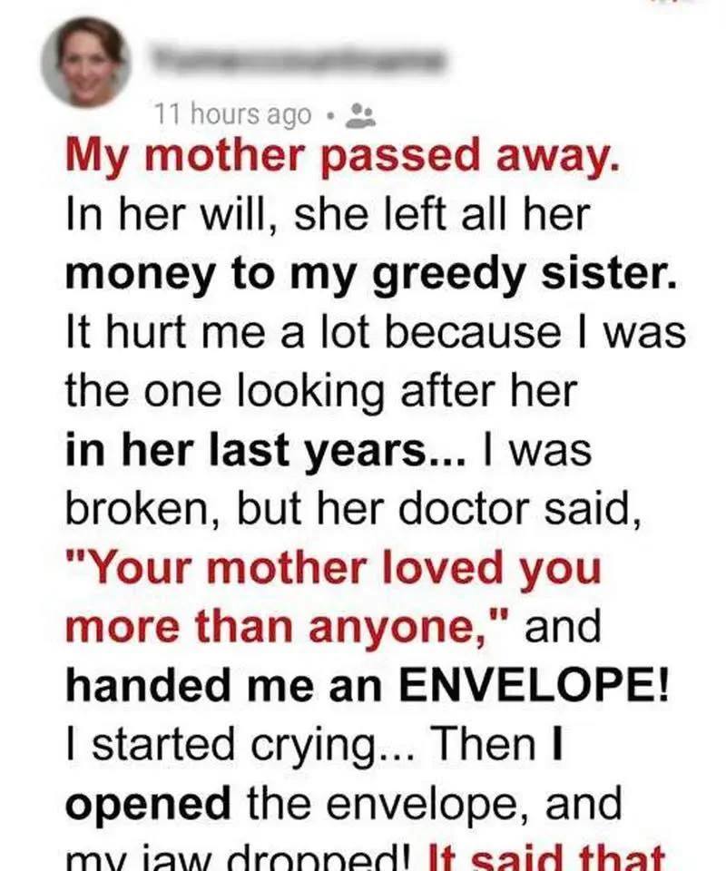 She never called Mom unless she wanted something. Designer bags. A “loan.” A way to fix the messes she always created.Meanwhile, I was the one who sat by Mom’s hospital bed every weekend, who brought her soup when chemo made her nauseous, who handled the paperwork and insurance when she was too tired to lift her head. I didn’t expect a fortune—but I didn’t expect to be erased, either. After the reading, I was numb.