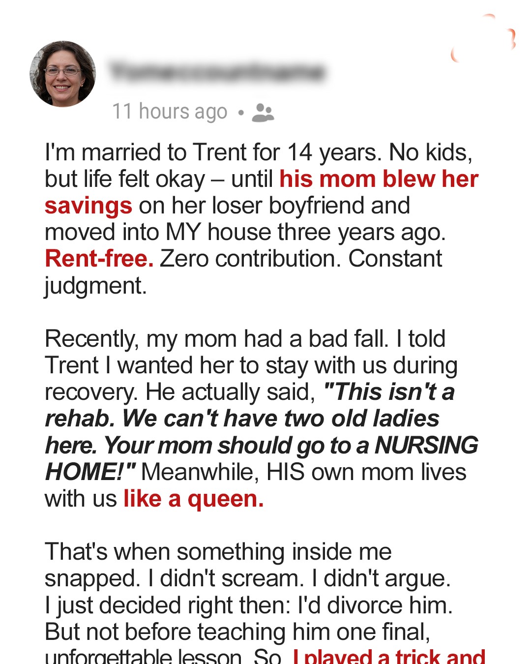 When Anna’s mother suffers a brutal fall, she expects support from her husband of 14 years. Instead, Trent coldly suggests a nursing home — while his petty mother lives in Anna’s house rent-free. That’s when Anna quietly decides: he’s about to learn a final lesson.