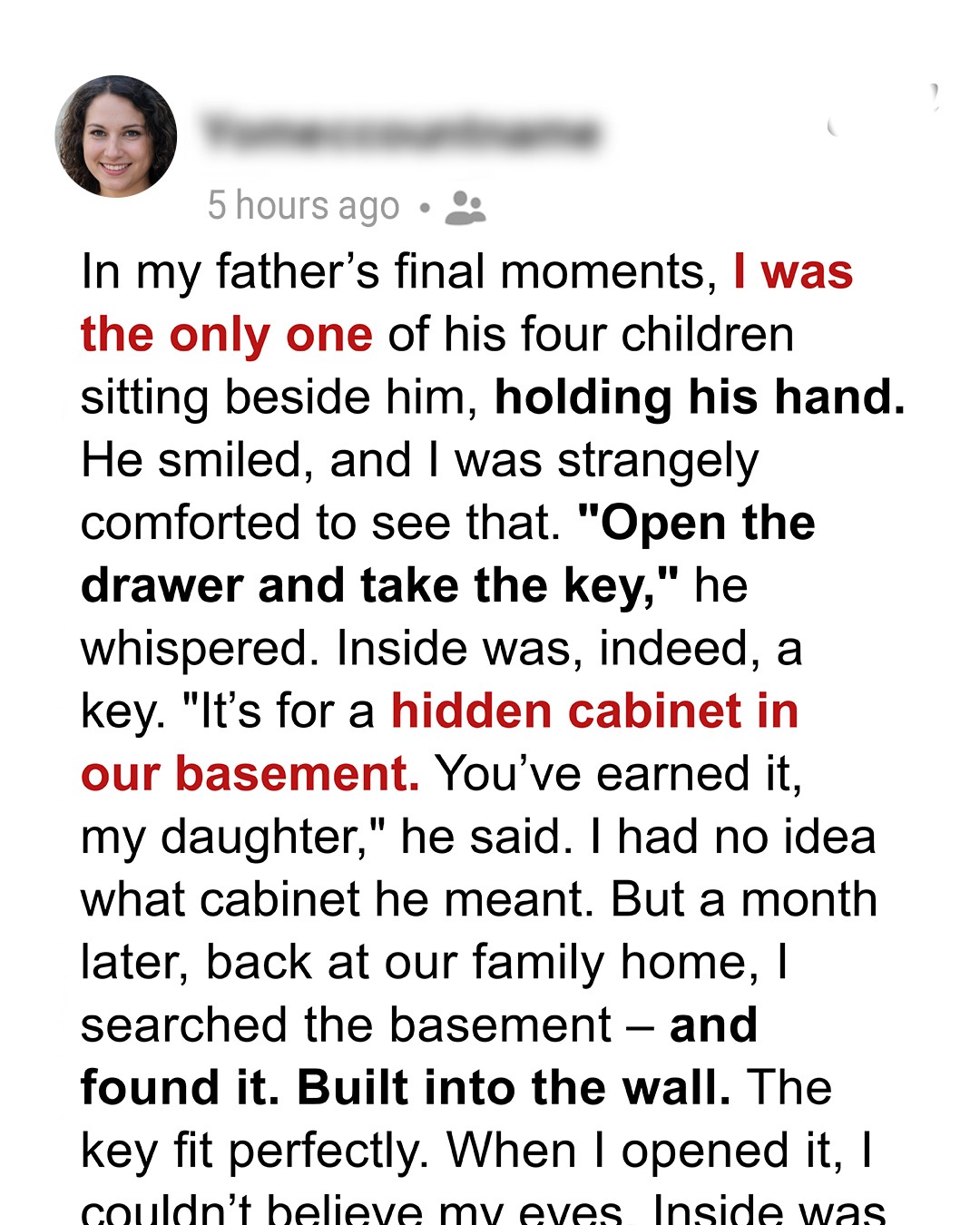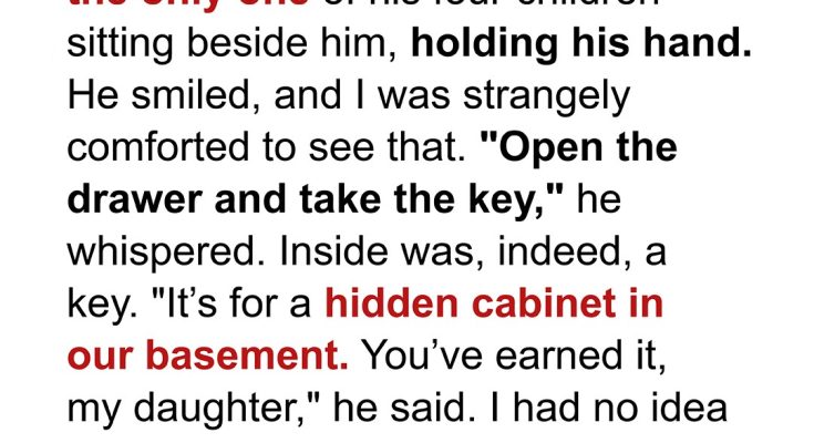 “Open the drawer and take the key,” my father whispered, his breath catching in the back of his throat, leading to a short coughing fit.After I’d helped him settle again, I blinked, unsure I’d heard him right. But he nodded slightly, pointing with a weak hand, and I obeyed. Inside the drawer of his nightstand, beneath some tissues and an old pocket Bible, was a single brass key.“It’s for a hidden cabinet in the basement,” he said with more strength than I expected. “You’ve earned it, my daughter.”