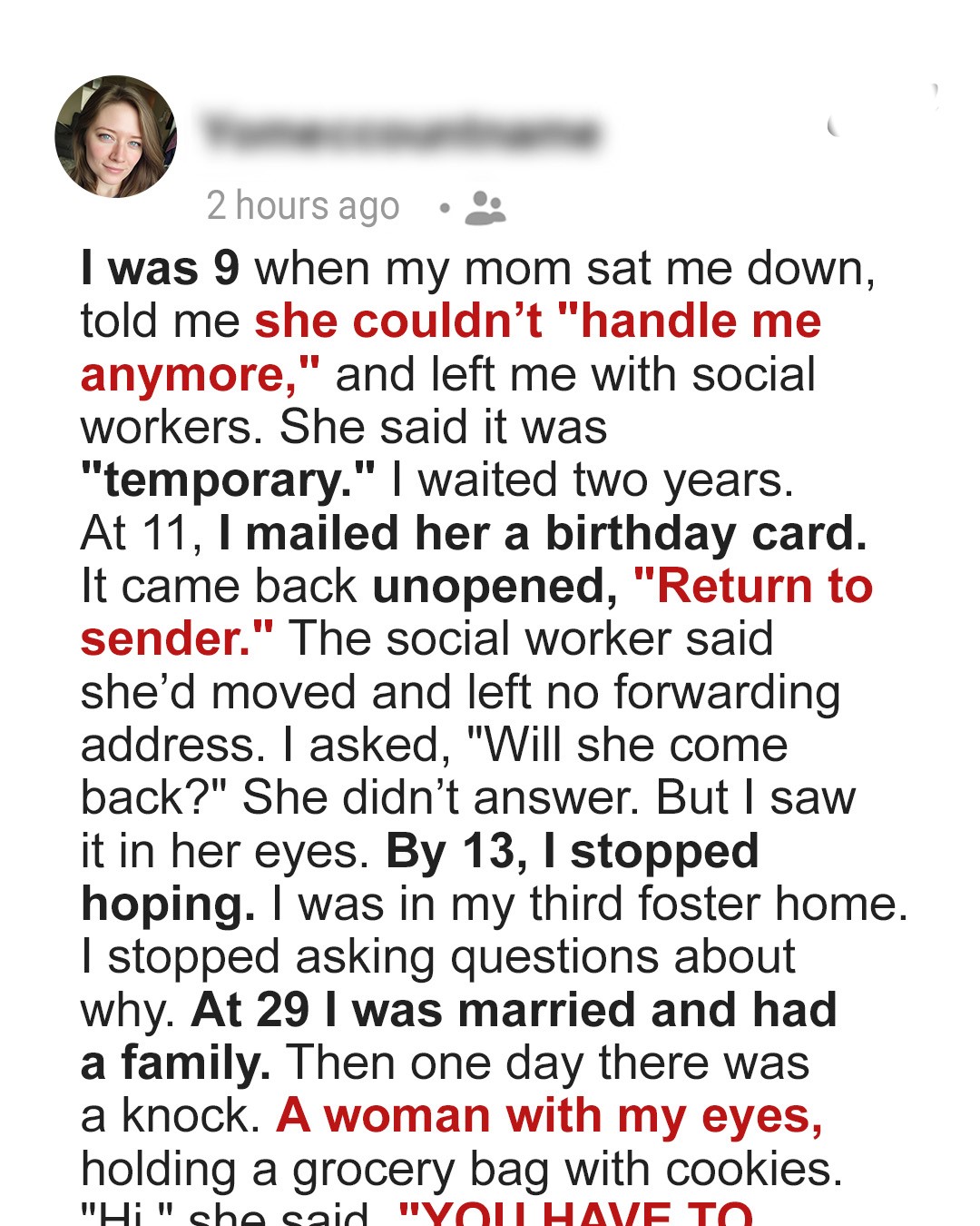 Twenty years after my mother walked out of my life, she showed up at my door with nothing but a grocery bag and demands. What she said next changed everything I thought I knew about forgiveness.My childhood feels like watching someone else’s life through a dirty window. Most of it is blurry, but some parts are crystal clear in all the wrong ways.