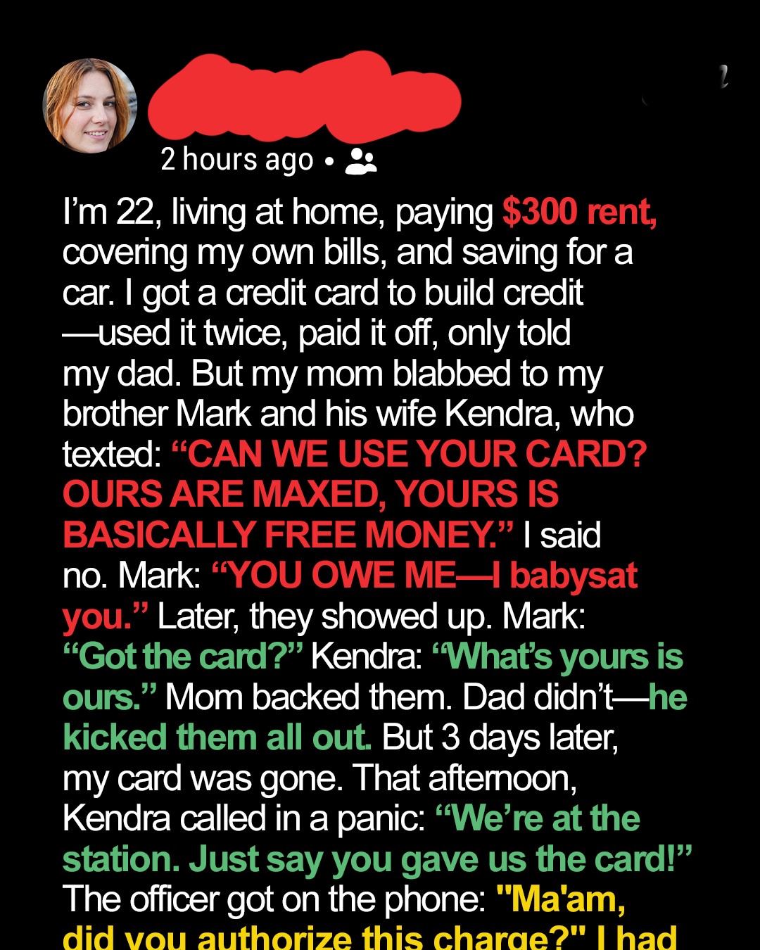 When my brother and his wife stole my credit card, they thought they were just taking plastic. What they really took was my trust. What happened next was something they didn’t see coming.I never planned to get a credit card.Growing up, I watched my parents argue about money and bills spread across the kitchen table. My mom would cry, and my dad would promise to work more overtime. I swore I’d never put myself in that position.